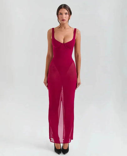 House Of Cb- Robina Wine Stretch Mesh Maxi Dress
